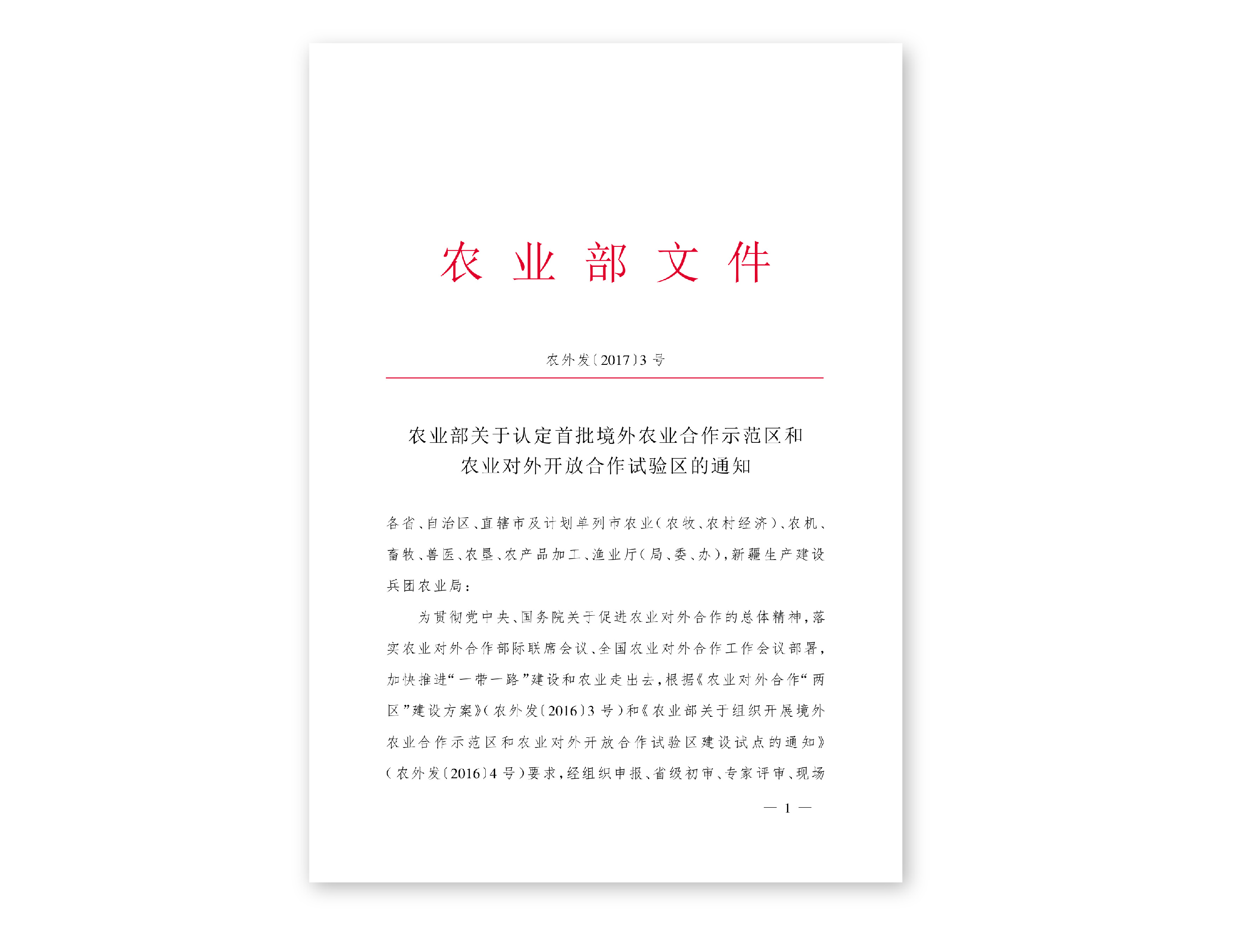農業部關于認定首批境外農業合作示范區和農業對外開放合作試驗區的通知